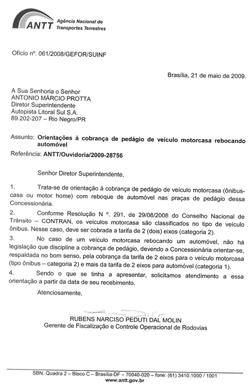 Com objetivo de trazer informação de utilidade aos proprietários e usuários de motor home, segue resposta de consulta formal que realizei junto a ANTT- Agencia Nacional de Transportes Terrestre, onde esclarece definitivamente o critério para a cobrança de pedágio de motor homes, quando estão rebocando um automóvel.